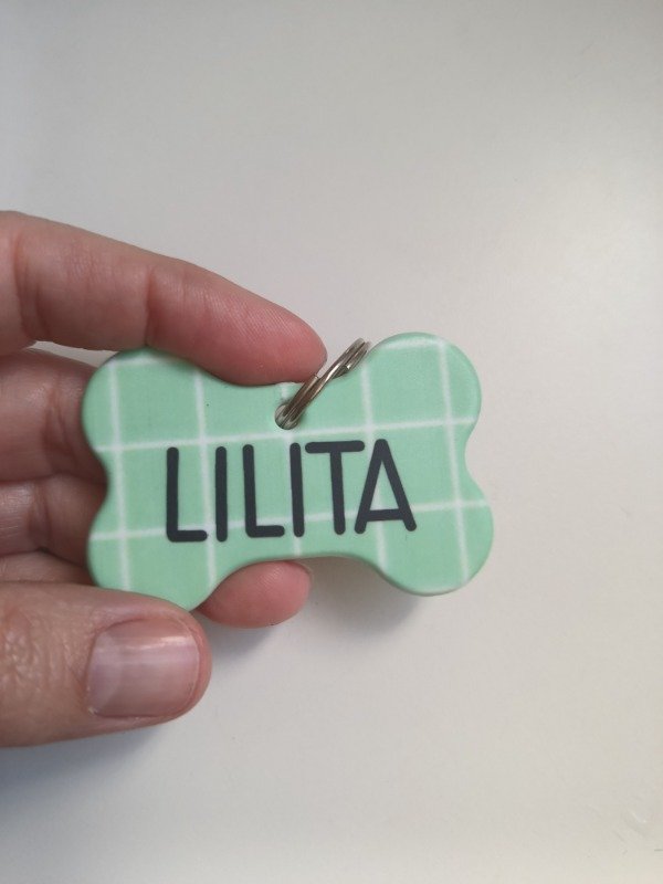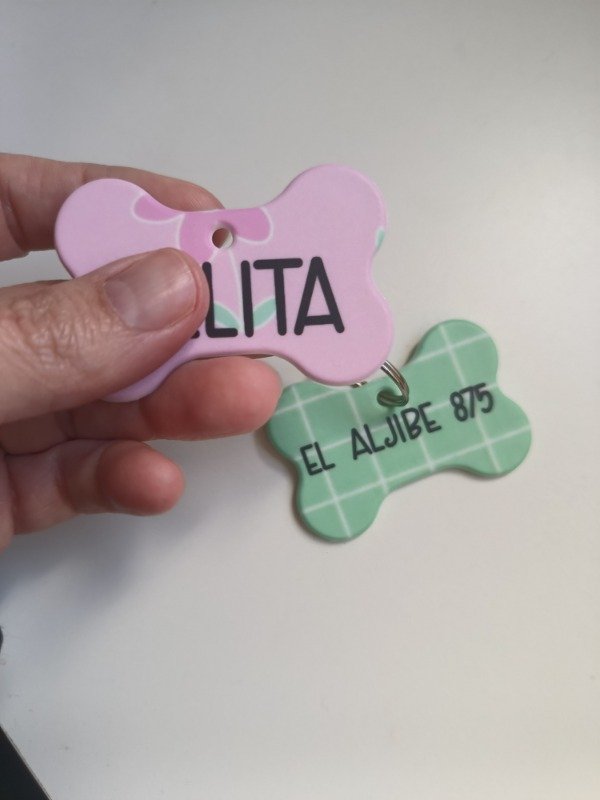 Llavero con forma de huesito, Ideal identificación para mascotas. Se estampa de ambos lados. Viene con argolla.
