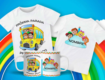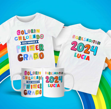 Set para egresaditos de jardín. Consta de una remera mangas cortas y taza plástica, con diseño recto con capacidad 350 cc. Todo con estampado temática Egresaditos, acompañada por la dedicatoria a elección, según catálogo.
